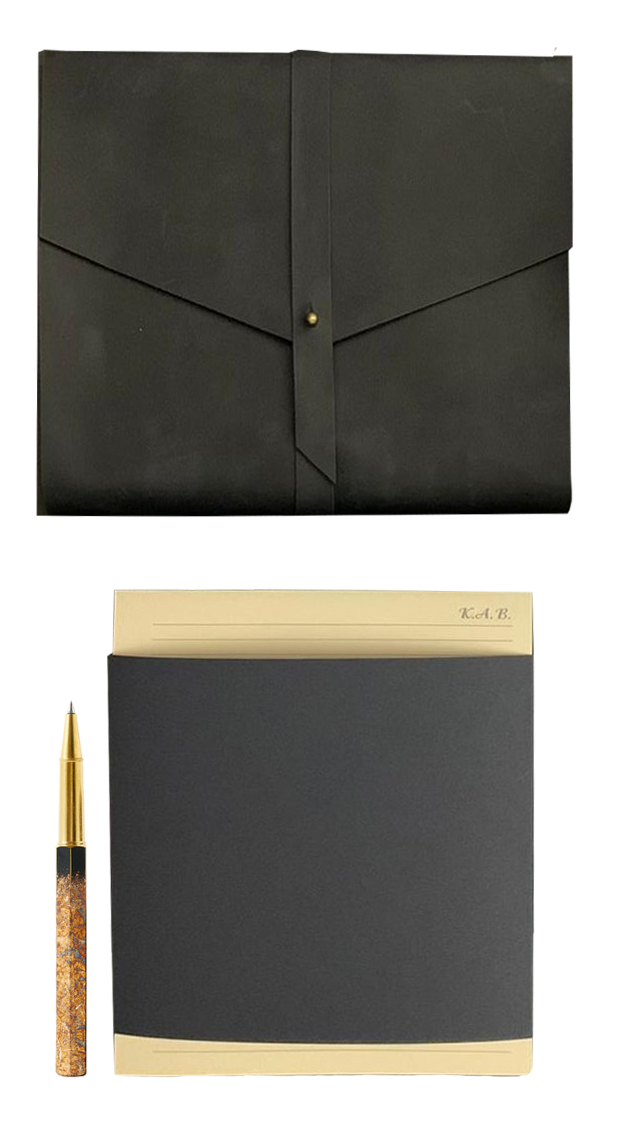 Классические кожаные блокноты мы решили сделать в формате travel-book — на застежке, в фирменном цвете компании, с дополнительными блоками. На каждом листе блокнота инициалы получателя подарка. Пишущие ручки — японские, из меди и латуни.